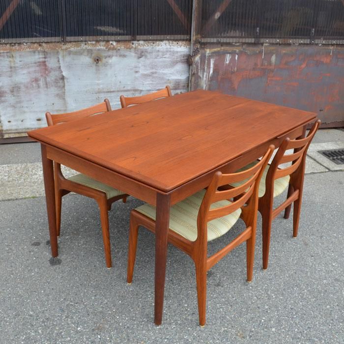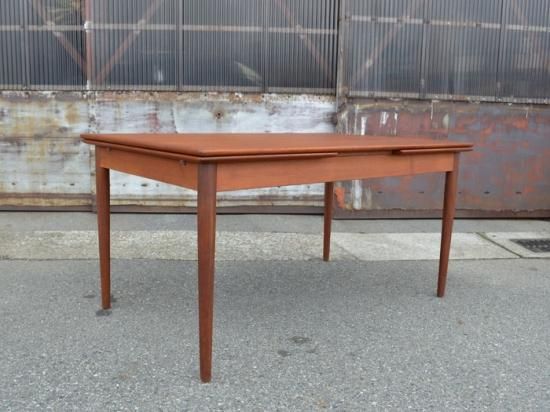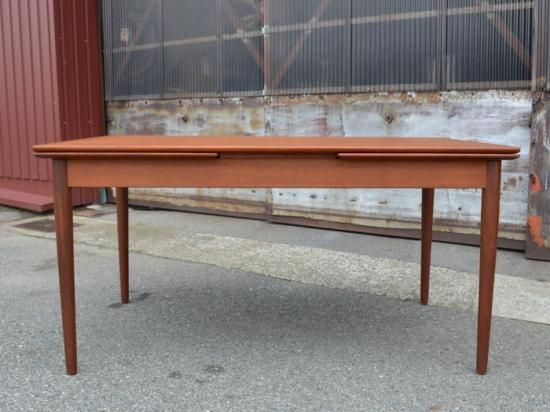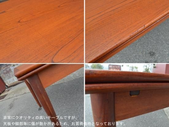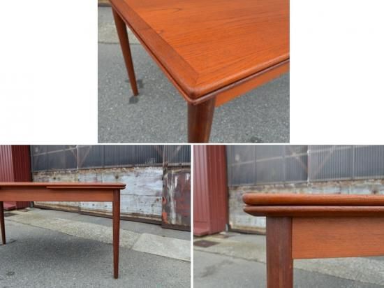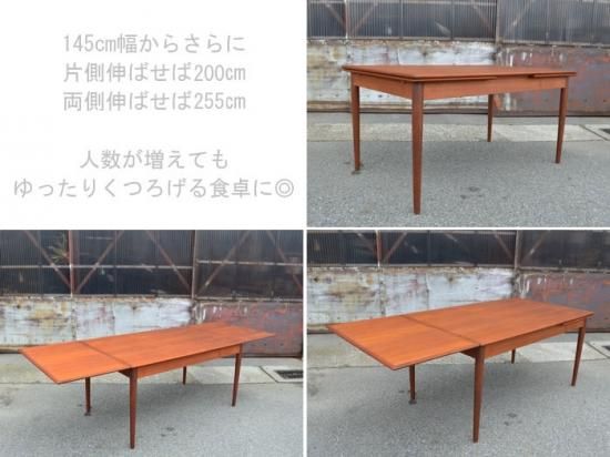 幅145cm、奥行90cmとデンマークヴィンテージの中でも比較的大きなゆったりサイズのテーブルです。 普段は4人でゆったり、もしくは幅があるので、お誕生日席にもう一人座って5人でも楽しくご飯が進みそう。 さらに人数が増えた時には、片側、両側のリーフを伸ばして、わいわい大人数で1つのテーブルを囲めます。 一定水準の条件をクリアした高品質の家具にしかつけることの許されないDanish Furniture Makers Controlのバッチ付き! そのクオリティの高さが証明されています。 長い年月を経て日本にやってきたこともあり、天板や脚部に傷が見られるため、このクオリティを鑑みるととてもお買い得な一台です。 大きめのダイニングテーブルをお探しの方にぜひおすすめしたい一台です。 ※乾燥と湿潤を繰り返す環境は、木材(特に無垢材)の湾曲の原因となります。 例えば、エアコンやヒーター、日光等が直接当たるような環境でのご利用は避けていただく事をおすすめします。 ※こちらのテーブルは組み立て式となっております。 お届けの際は、脚を取り外してお送りいたします。 組み立てにはモンキーレンチ等をご使用ください。 −−−−−−−−−−−−−−−−−−−−−−−−−− ユーズド特有の経年変化による色むらや小さなキズがある場合があります。 ご不安等ございましたら、小さな事でもかまいませんのでご質問いただき、ご納得の上お買い上げください。 お使いのPC環境により、異なった色に見えることがあります。 以上をご了承ください。 *1点ものの商品のため、ご注文のタイミングによりタイムラグなどで商品が完売している場合がございます *テーブルのみの価格です。 *配送区分は大型宅配便 開梱・設置Dです。吊り上げ等搬入に必要な場合は別途加算されます。 *ご購入後必要なくなった場合は下取りもいたします。ご相談ください。 *他店でご購入になったデンマークヴィンテージ家具も下取りをうかがいます。ご相談ください。 | |