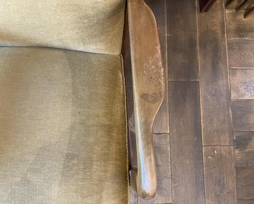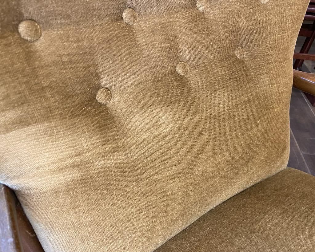 広いウィングバックの背中、イエローゴールドのモケット生地。