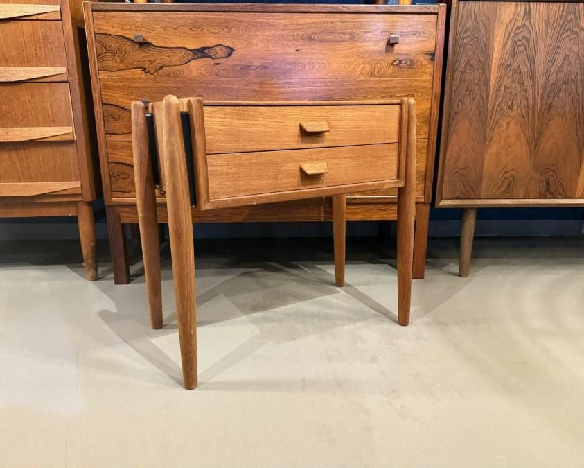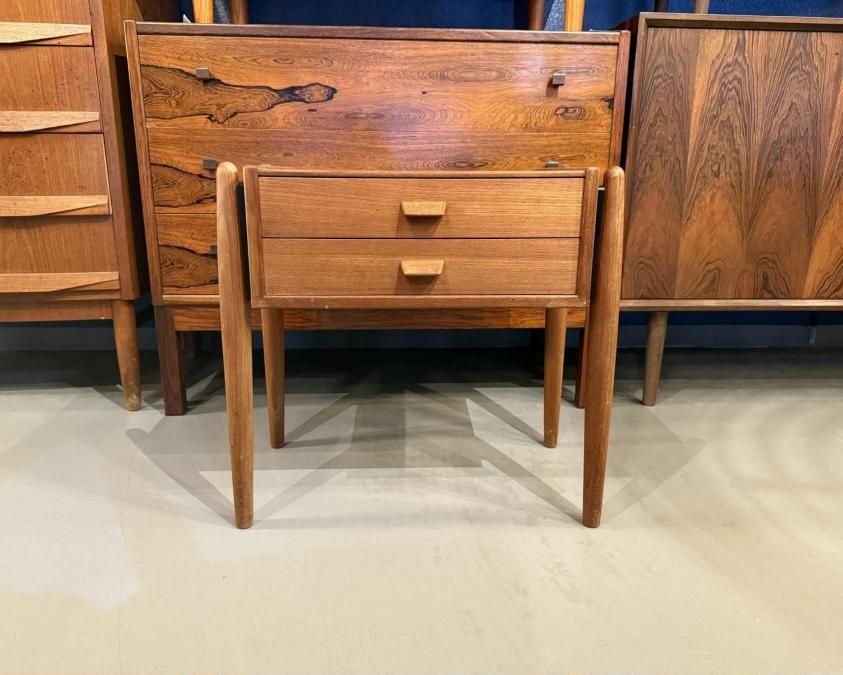 サイドに飛び出た丸脚と取っ手の形がかわいらしいナイトチェスト。