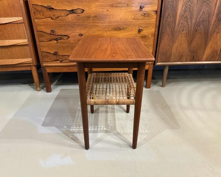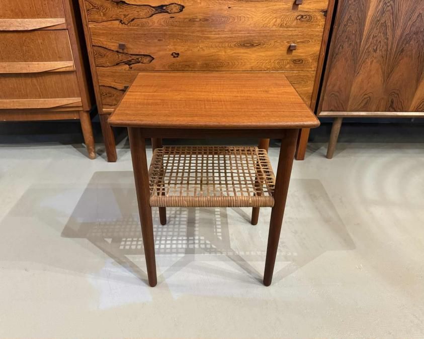 材料 天板:チーク突板 木口・脚:チーク無垢 ラック:ラタン