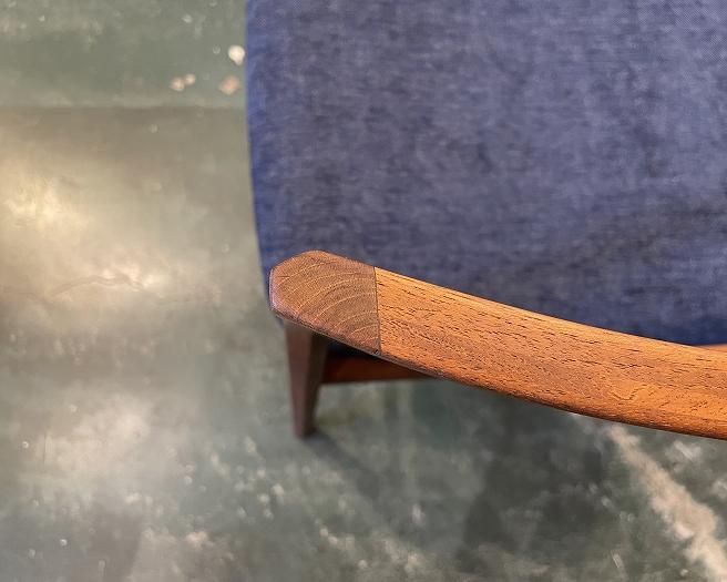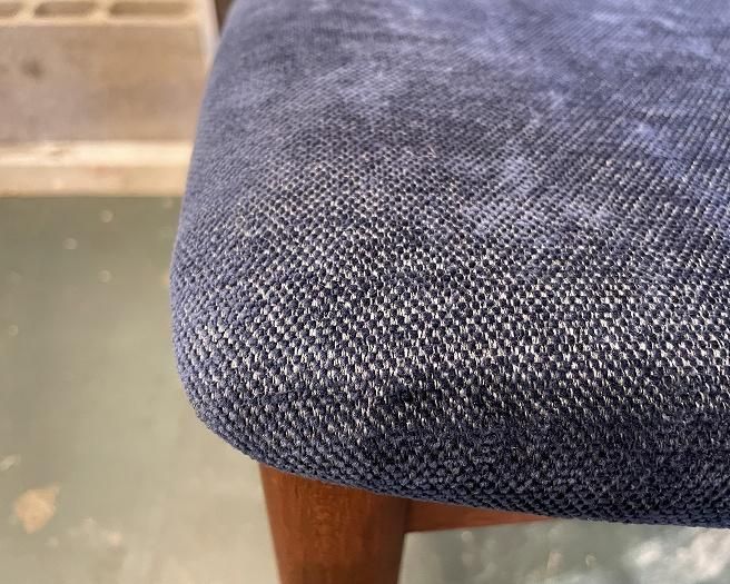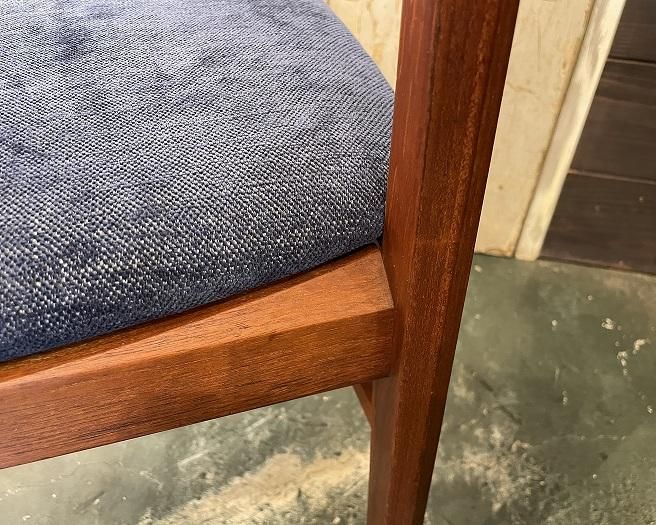 座面は海外より輸入したネイビー色のファブリックにて張替え、中のウレタンも交換しております。