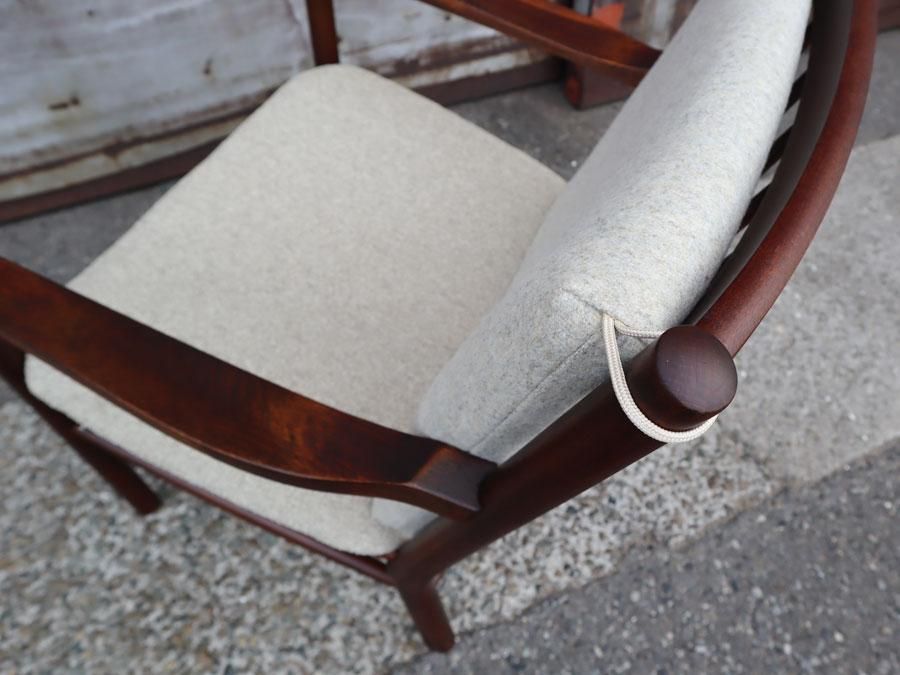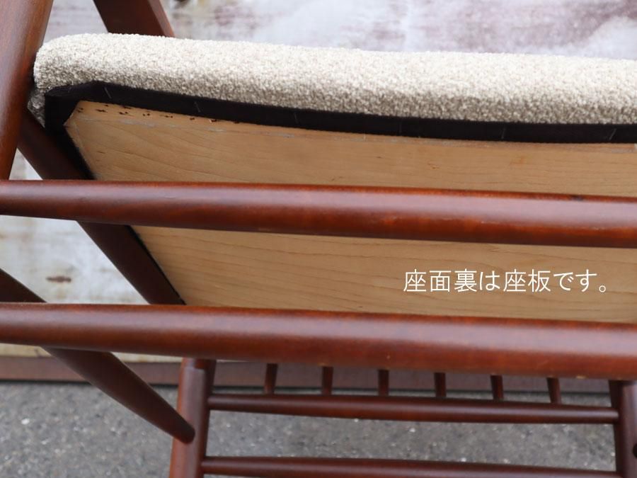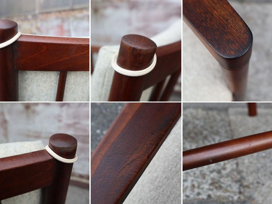 メンテナンス内容 木部:接合部のうち、ゆるみの確認できる部分の留め直し。古い塗装を剥離後再塗装。 ファブリック部:ウレタンクッション新規作成。生地張替え。