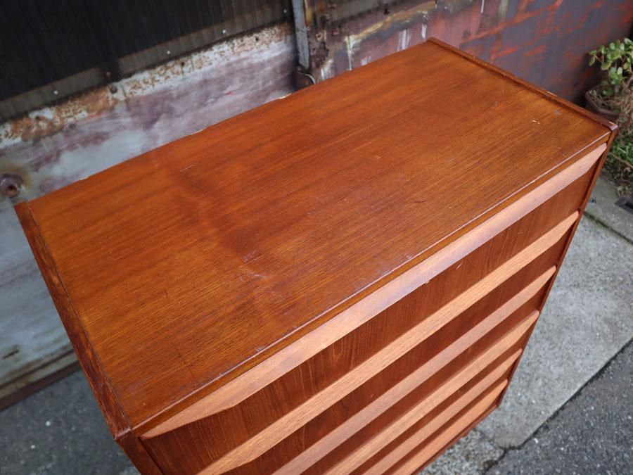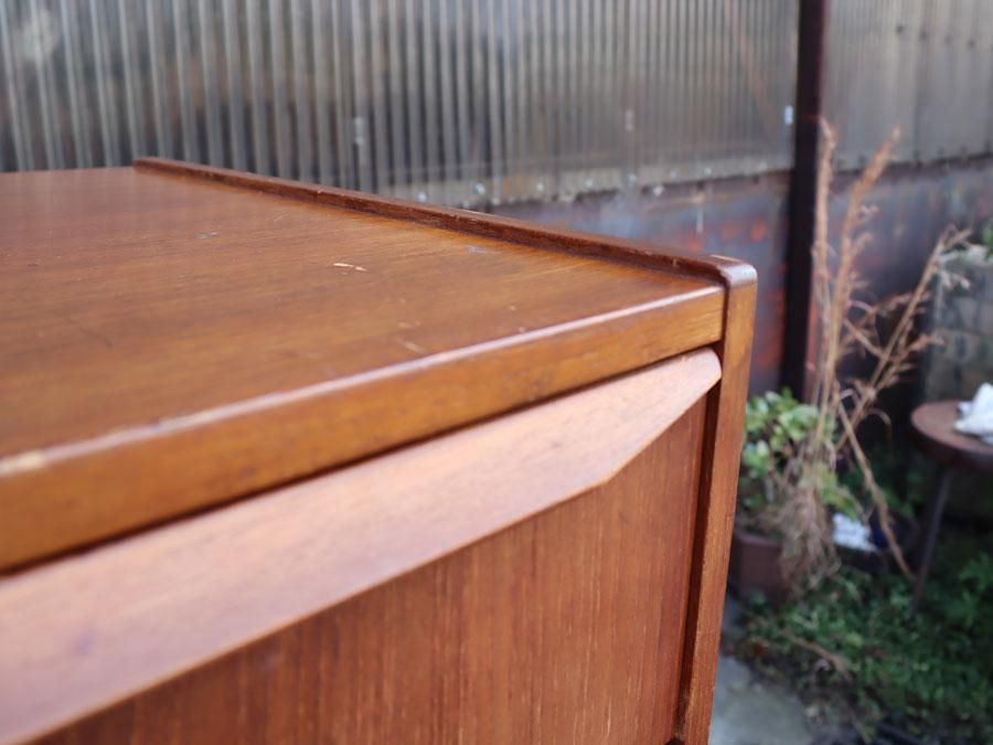 現代のチェストや本棚は、基本的に側板の上に天板が乗るような板の合わせ(横がち)で造られていますが、北欧ヴィンテージでは側板が天板を挟んでいる造り(縦がち)が多いです。